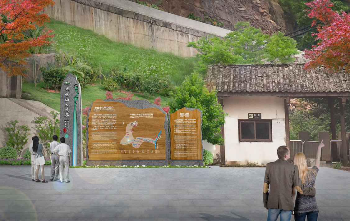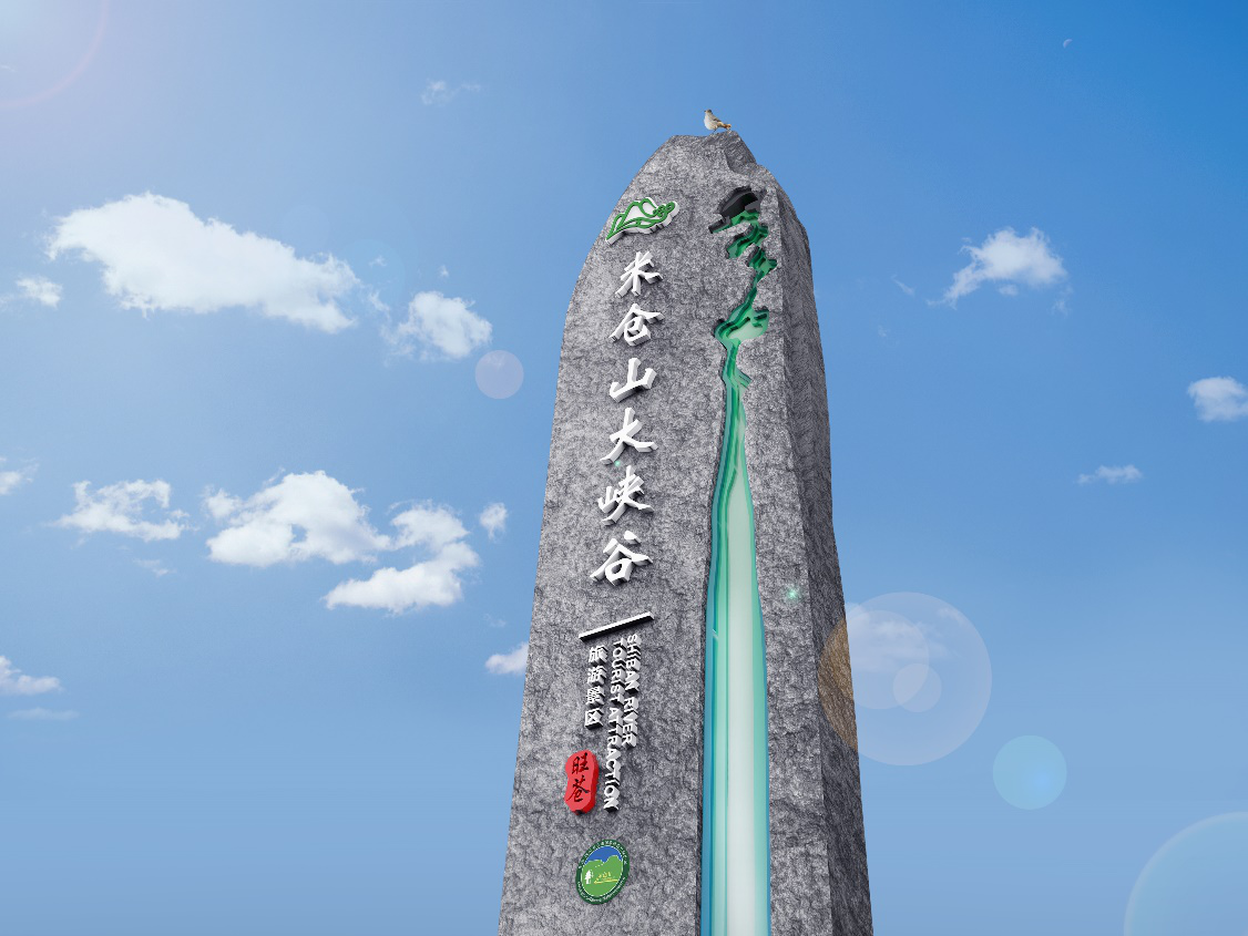 米倉(cāng)山以獨(dú)特的地質(zhì)構(gòu)造景觀為特點(diǎn),以奇特的山、水、石而著名,遍布整個(gè)景區(qū)。本次設(shè)計(jì)利用米倉(cāng)山這一獨(dú)特點(diǎn),結(jié)合景區(qū)環(huán)境進(jìn)行改造,景區(qū)大門采用米倉(cāng)山景區(qū)特有的沉積巖和紅葉進(jìn)行設(shè)計(jì),把景區(qū)特色融入到設(shè)計(jì)中,更加符合當(dāng)?shù)匚幕厣?,與環(huán)境融為一體。紅葉作為基礎(chǔ)輪廓,色彩鮮明,具有視角沖擊;沉積巖作為紅葉兩側(cè)的輔助,使大門更加立體更加吸引人。
