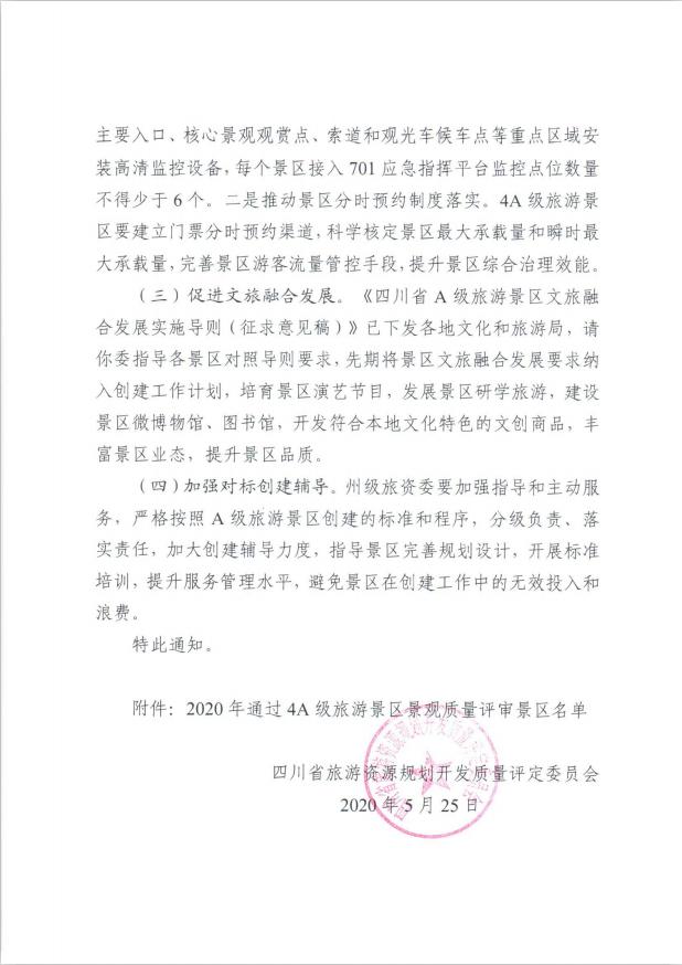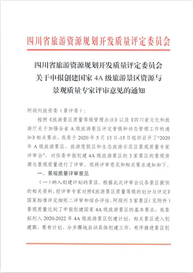 近日,四川省旅游資源規(guī)劃開(kāi)發(fā)質(zhì)量評(píng)定委員會(huì)通報(bào)了2020年申報(bào)創(chuàng)建4A級(jí)旅游景區(qū)景觀資源與景觀質(zhì)量專家評(píng)審會(huì)結(jié)果。